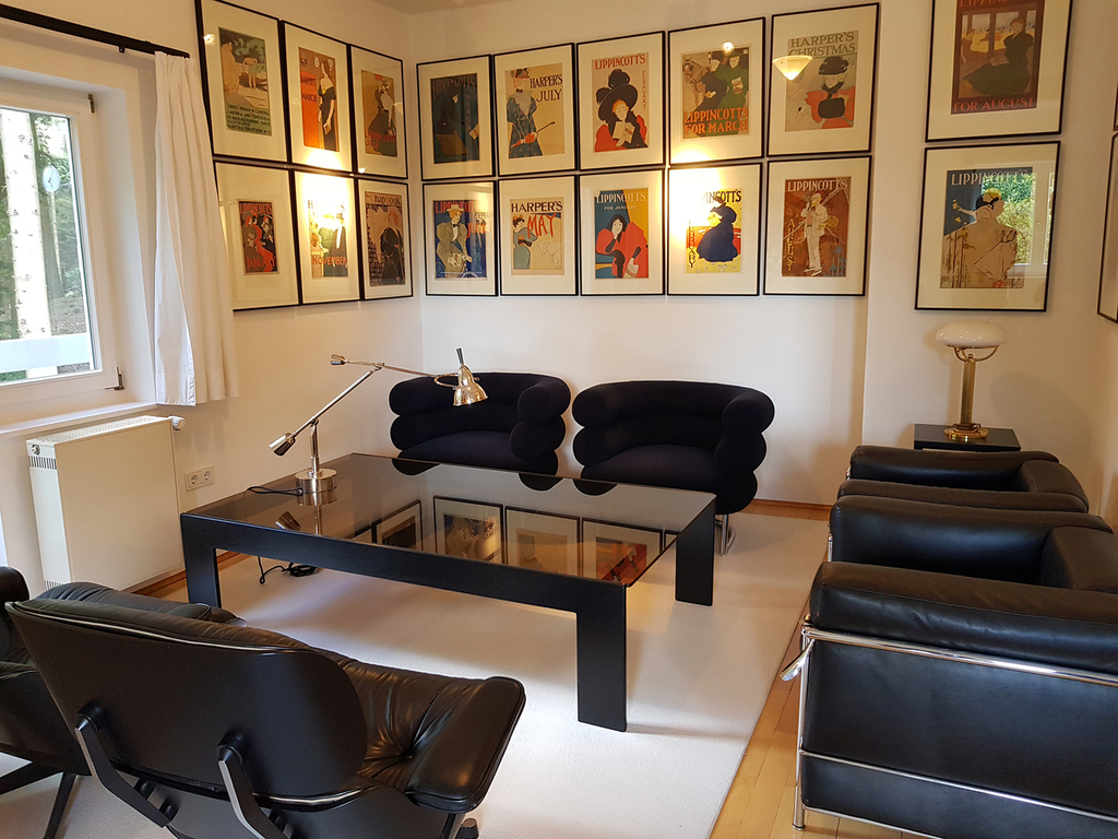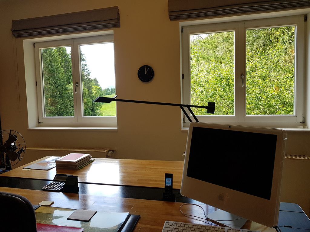 Wohnzimmer gelegen befindet sich hier, mit traumhafter Aussicht, ein Zimmer aufgeteilt in einen Arbeitsbereich und einen Bereich mit Sitzgarnitur und Balkon.