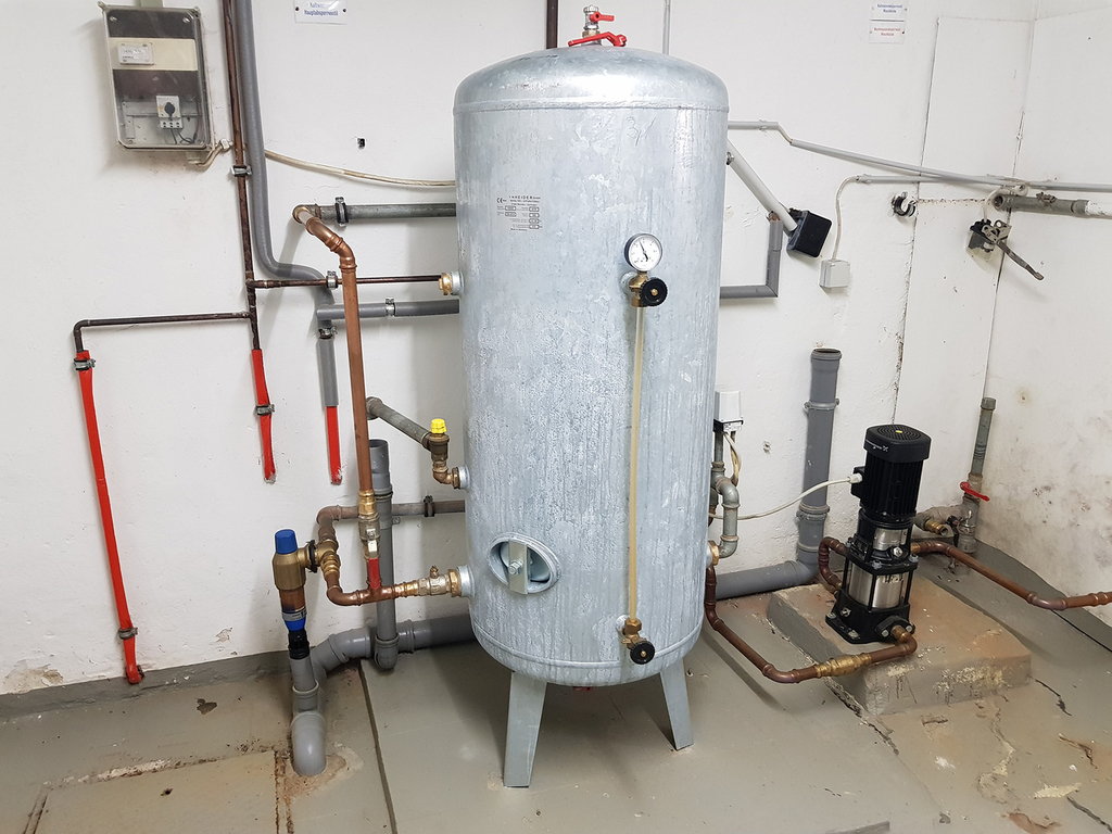Heizungskeller mit Brenner, Kellerraum mit vier Öltanks und Wassertank. Die Anlage für die eigene Wasserversorgung ist 2017 erneuert worden: frostsicher, technisch verbessert, tiefere Gewinnung.